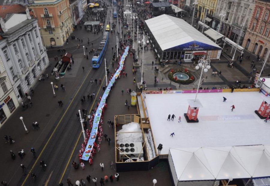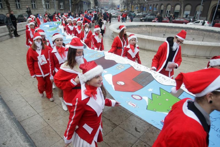 Večernjakova najduža božićna čestitka duga 100 metara razmotana je danas popodne na Trgu bana Josipa Jelačića nakon čega ju je povorka Djeda Mrazova odnijela na Trg žrtava fašizma gdje ju je omotala oko zgrade Hrvatskog društva umjetnika. Čestitku koja se počela izrađivati na Svetog Nikolu radila su djeca iz cijele Hrvatske, a idejni joj je začetnik Aleksandar Kovačević. Osim brojnih poznatih poput igrača Medveščaka, glumaca i pjevača, na čestitku se jutros potpisao i predsjednik Ivo Josipović.