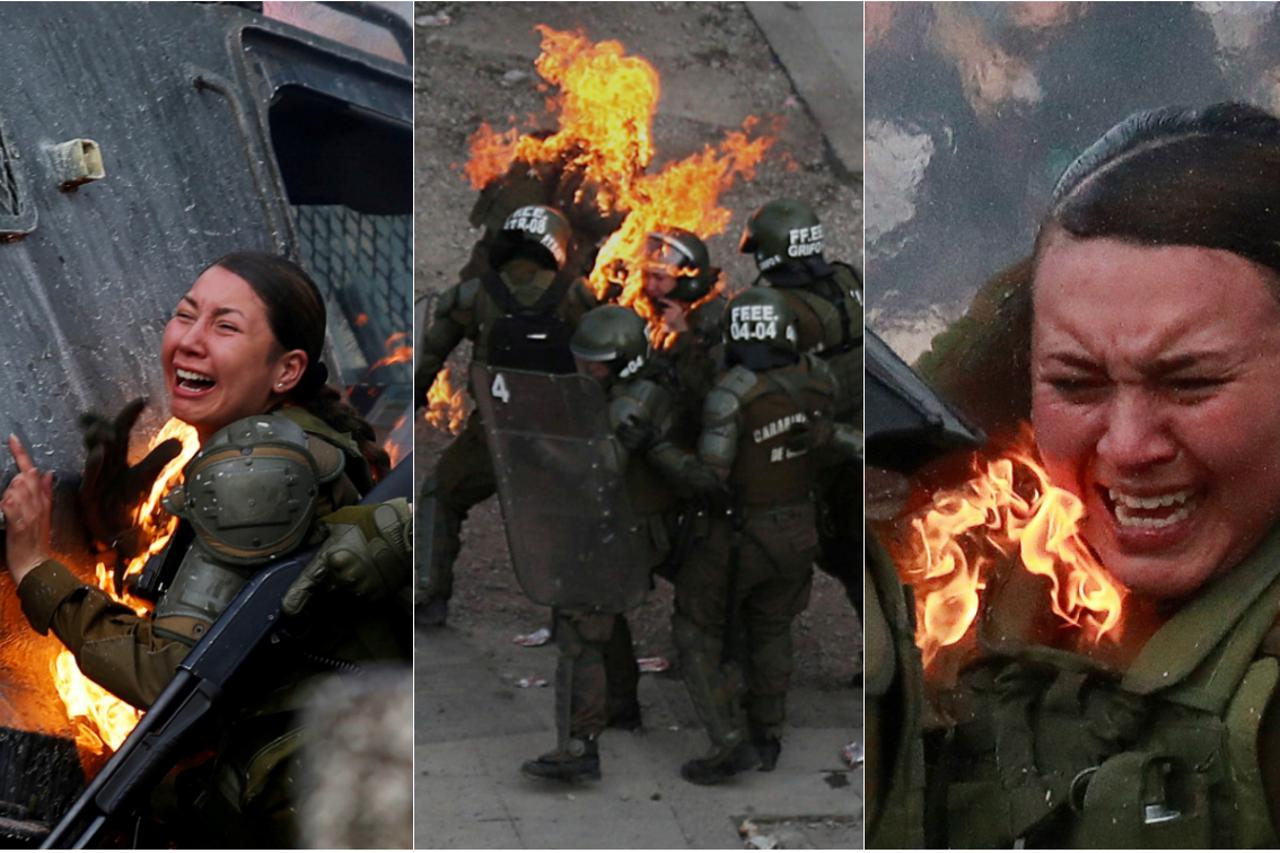 7 Potresne fotografije Eskalacija nasilja u Čileu: Prosvjednici Molotovljevim koktelima zapalili dvije policajke Ministar unutarnjih poslova Gonzalo Blumel obišao je žrtve, a napad je nazvao "čistim nasiljem koje nema nikakve veze s legitimnim zahtjevima prosvjednika"