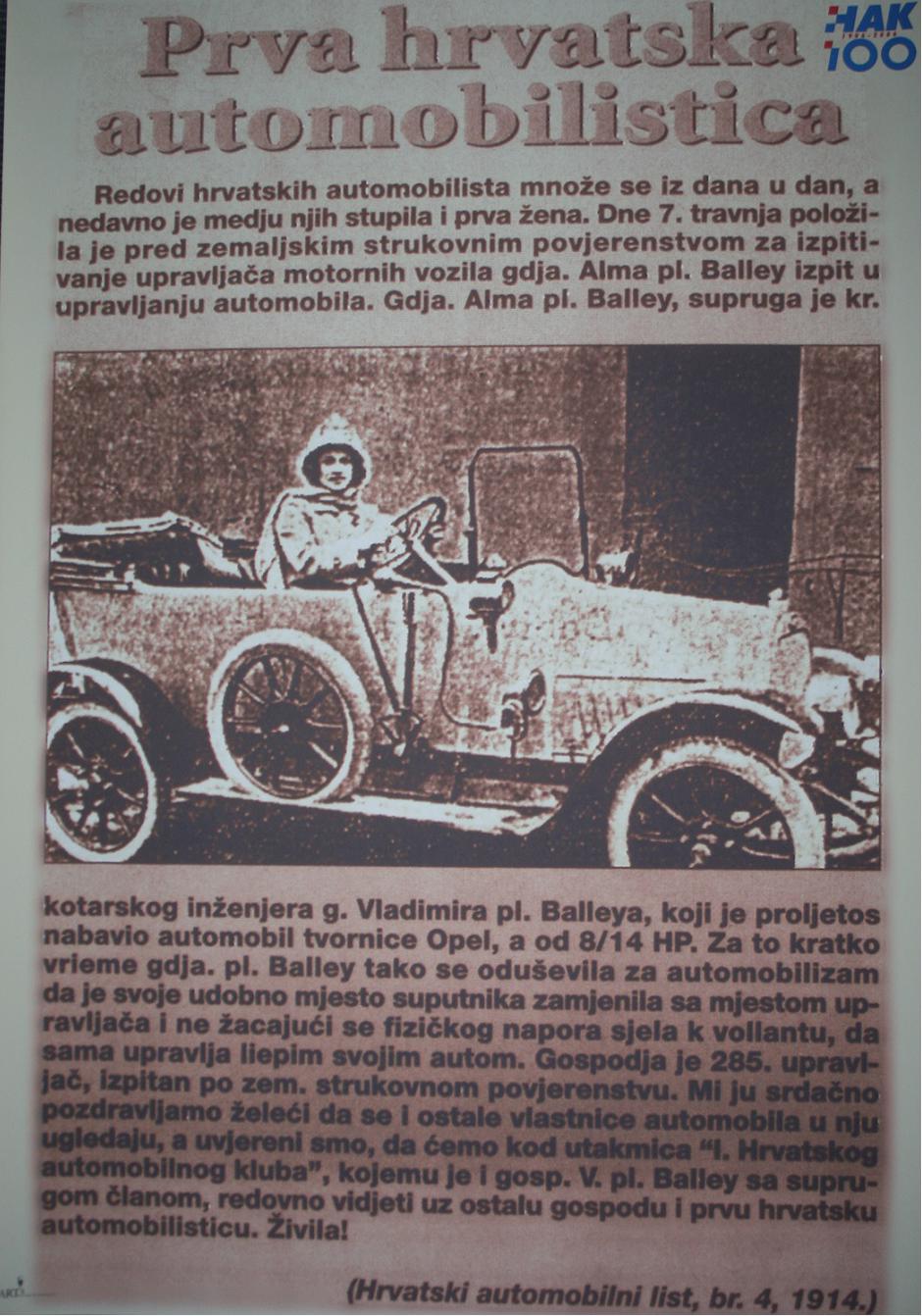Hrvatski autoklub obavijestio je kako se danas navršilo 100 godina otkako je prva žena u našoj zemlji položila vozački ispit. Dana 7. travnja 1914., kako je izvijestio Hrvatski automobilni list br. 4, gđa. Alma pl. Balley, položila je „pred zemaljskim strukovnim povjerenstvom za ispitivanje upravljača motornih vozila ispit u upravljanju automobila“.