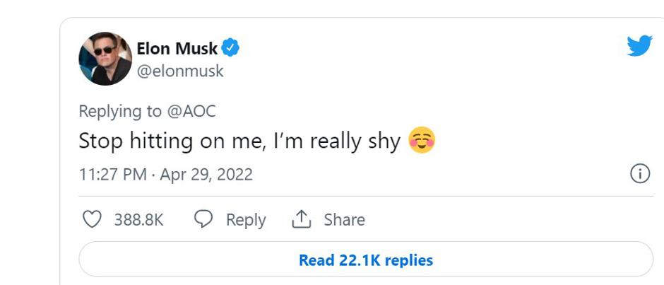 Ali Musk je odgovorio na taj tvit, i poručio: "Prestani mi se nabacivati', stvarno sam sramežljiv", nakon čega je uslijedio emoji sa smješkom. Ocasio-Cortez je uzvratila: "Govorila sam o Zuckerbergu, ali u redu", u očitoj referenci na izvršnog direktora Mete Marka Zuckerberga, a zatim je izbrisala taj u roku od 57 sekundi, prema arhivi izbrisanih tvitova političara koju čuva ProPublica, prenosi Bloomberg, koji kaže da im na upit o tome nije odgovorila