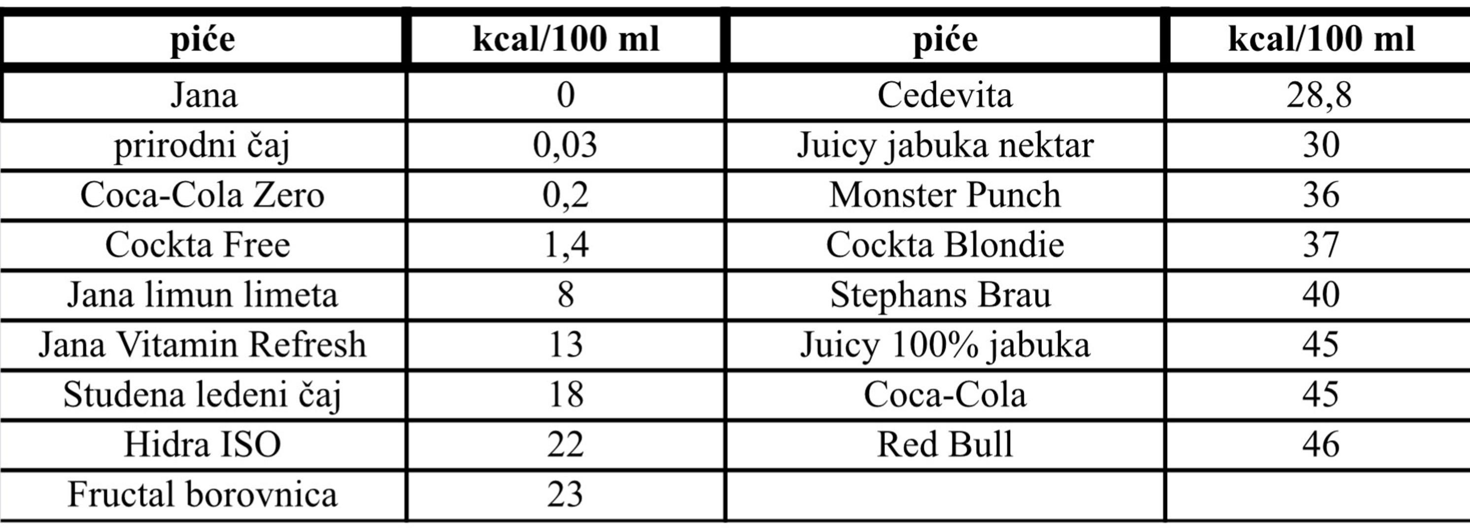 Otkad je proljeće zimu svrgnulo s trona već smo doživjeti i više nego proljetne, gotovo ljetne temperature, a 28 stupnjeva Celzija najavljeno je i za ponedjeljak, u dijelu kontinentalne Hrvatske. Hidracija organizma važna je kroz čitavu godinu, no nekako nam u prvi plan obično iskoči s rastom temperatura zraka. Čime se hidrirati, a da pritom u sebe ne unosimo više kalorija nego što bismo htjeli i trebali, pogotovo sad, kad svi više-manje razmišljamo i kako do ljeta izgubiti višak kilograma nakupljen u hladnijim mjesecima? Analizirali smo 17 opcija, 17 pića iz domaćih trgovina – neke s oznakom da su bez šećera, neke gazirane, neke negazirane... - a našla se tu i dobra stara voda. Voda je, naravno, uvijek najbolji izbor jer najbolje utaži žeđ i uopće nema kalorija. No, često smo željni nekog okusa, nečega da pobudi osjetila, bilo da su to mjehurići ili nešto slatko ili nešto voćno ili nešto da nas malo podigne. Krenimo od osnova, od vode. Za primjer smo ovdje uzeli bocu Jana prirodne mineralne negazirane vode. Pola litre košta 0,79 eura. Kalorija, kazali smo, nema jer nema ni bjelančevina, ugljikohidrata ni masti. Međutim, odaberete li neku od voda s okusom, s dodacima, računajte i na nešto kalorija. Malo, ali ipak... Konkretno, Jana s okusom limuna i limete, boca od pola litre, stoji 0,99 eura. Ovo niskoenergetsko negazirano piće ima šećera (1,9 grama) pa na 100 ml ima osam kalorija. Volite li osvježavajući okus limuna i limete, svidjet će vam se i ova osvježavajuća voda s okusom koju proizvodi zagrebačka Jamnica. Autorici ovih redaka osobni je favorit treća opcija, Jana Vitamin Refresh čijih pola litre košta 1,15 eura. Okus je kombinacija mente i limete, a ova kombinacija ima i vitamine C, B3, B6 i B12. Kako je navedeno na deklaraciji, niskoenergetsko negazirano osvježavajuće bezalkoholno piće s okusom mente i limete (od koncentriranog soka) ima i šećera i sladila. Sladila su steviol glikozidi iz stevije i sirup invertnog šećera, a na 100 ml Jane Vitamin Refresh ima 13 kcal, budući da ona ima 3,1 g šećera. Više od obične vode ili ranije analizirane vode s okusom, no ipak daleko ispod količina na koje smo naišli u raznim sokovima.