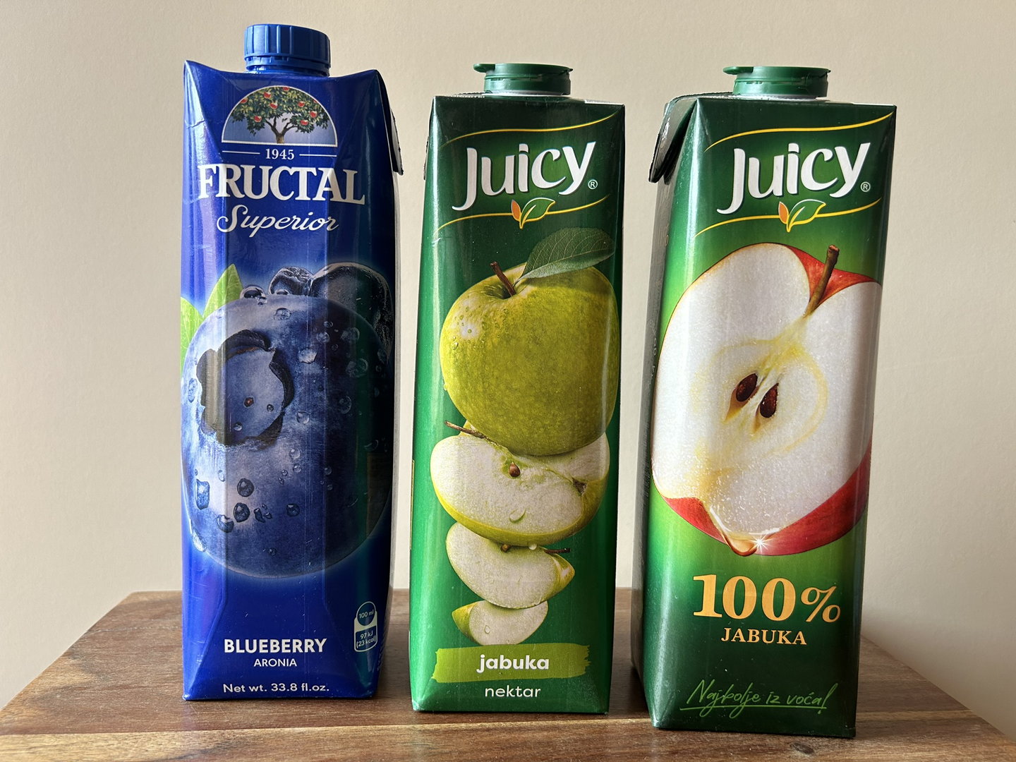 Vraćamo se na opcije koje će nam ugasiti žeđ, a da ih pritom ne trebamo skrivati od djece. Fructalov nektar od borovnice i aronije ima zaslađivače (sukraloza), ali na deklaraciji se navodi da je smanjene energetske vrijednosti. Proizveden je u Sloveniji od koncentriranog voćnog soka, udio voća je najmanje 35%. Na 100 ml donosi 23 kcal, 3,3 g šećera. Valja znati da ima i 4% željeza. Okus je pun, intenzivan, ni previše ni premalo sladak. Drugi sok, Juicy od jabuke koji se proizvodi u Zagrebu, analizirali smo u dvije varijante. Prva je 100-postotni sok. Iako bismo iz te naznake zaključili da je riječ o 100% prirodnom, cijeđenom soku od jabuke, on je napravljen od koncentriranog soka. Također, na deklaraciji stoji i da jabuke ne potječu iz Hrvatske, ne navodi se otkud su. Bez obzira na koncentrat, sok miriši na pravu jabuku. Okus mu je izrazito slatkast, nekima i presladak pa ga razrjeđuju s vodom. Litra košta 2,99 eura. Na 100 ml ima deset grama šećera, 45 kalorija. Druga opcija, Juicy jabuka nektar, po litri stoji 1,79 eura. I ovdje je s jabukom ista situacija: Stanić Beverages proizvodi u Zagrebu, ali jabuke ne potječu iz Hrvatske. Sok se radi od koncentriranog soka jabuke, a udio voća je najmanje 50%. Okus nam se svidio, manje je intenzivan od 100-postotnog. Također sadrži šećer i sladilo (sukraloza). Na 100 ml šećera je 7,1 g, kalorija ima 30.