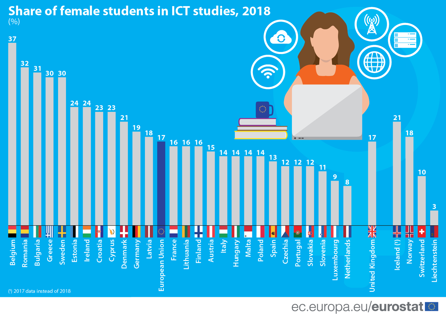 Među državama članicama EU Belgija se istaknula s obzirom da je u 2018. godini bilo 37% studentica ICT-a u. Udio IKT studentica bio je blizu trećine također u Rumunjskoj (32%), Bugarskoj (31%), Grčkoj i Švedska (obje 30%). Suprotno tome, studentice su imale manje od 10% u Nizozemskoj (8%) i Luksemburgu (9%).