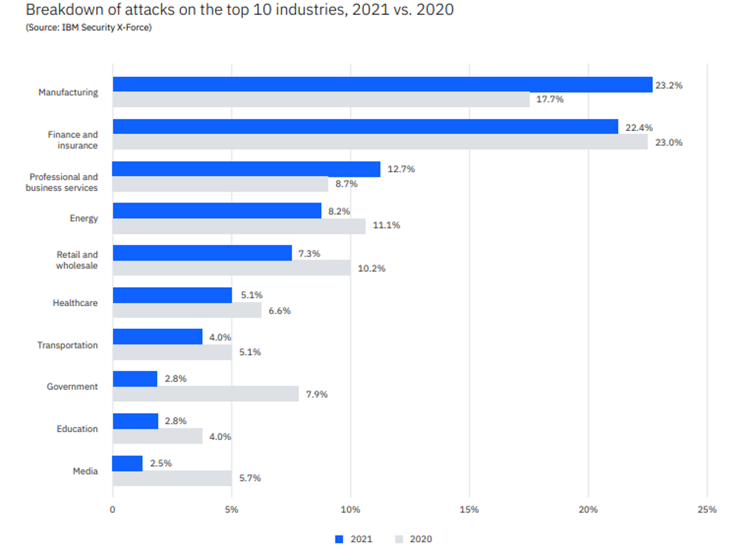 Veliki godišnji izvještaj IBM-ove X-Force jedinice za kibernetičku sigurnost otkriva kako je upravo proizvodna gospodarska djelatnost bila najčešća meta cyber napada (čak 23 posto svih napada na industriju). Što je velika promjena, jer su obično financijske institucije bile uvijek najviše targetirane. No, također, obično financijske institucije najviše i ulažu u sigurnosne sustave.