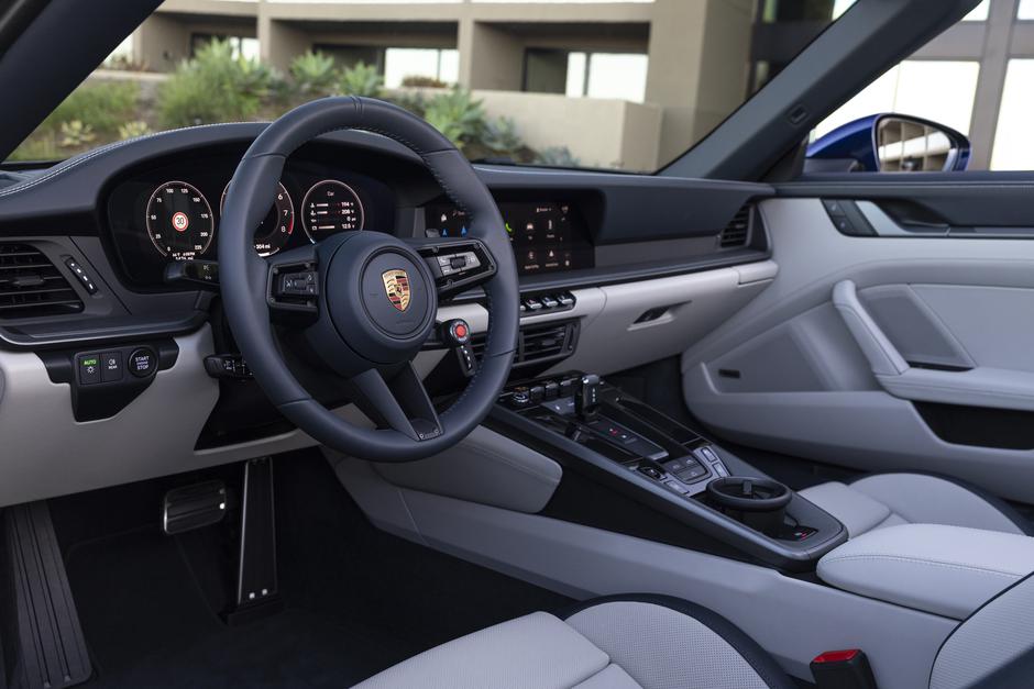 Glavne promjene, međutim, primjetne su tek u vožnji koju započinjemo u Cabrioletu Ice sive boje. Unatoč svježem proljetnom jutru, odmah spuštamo crveni platneni krov (pet je raspoloživih boja), a umjesto okretanjem ključa-prekidača lijevo od upravljača, 911 se sada pokreće novom “Start Engine” tipkom. Odlučan pritisak budi straga ugrađeni trolitreni bokser čiji su novi turbopunjači iz GTS-a (992.1) snagu šestcilindraša s dosadašnjih 450 podigli na 480 KS. Okretni moment od 530 Nm ostao je nepromijenjen, no raspoloživ je u puno većem rasponu nego prije, od 2200 do oko 6000 o/min, s ciljem da se Carreru S učini još upotrebljivijom u svakodnevici. U tome ulogu igra i serijski PDK s dvostrukom spojkom koji je ujedno jedina opcija mjenjača. Naime, ručni mjenjač kod prijašnjeg modela biralo je samo 20 posto kupaca u SAD-u i njih još manje u Europi, pa ga Porsche više ne nudi za ovaj 911. Ono što se također više ne nudi kao opcija, nego ugrađuje serijski jest sportski ispušni sustav koji, ako ujutro ne želite ometati susjede, možete utišati pritiskom tipke na središnjoj konzoli.