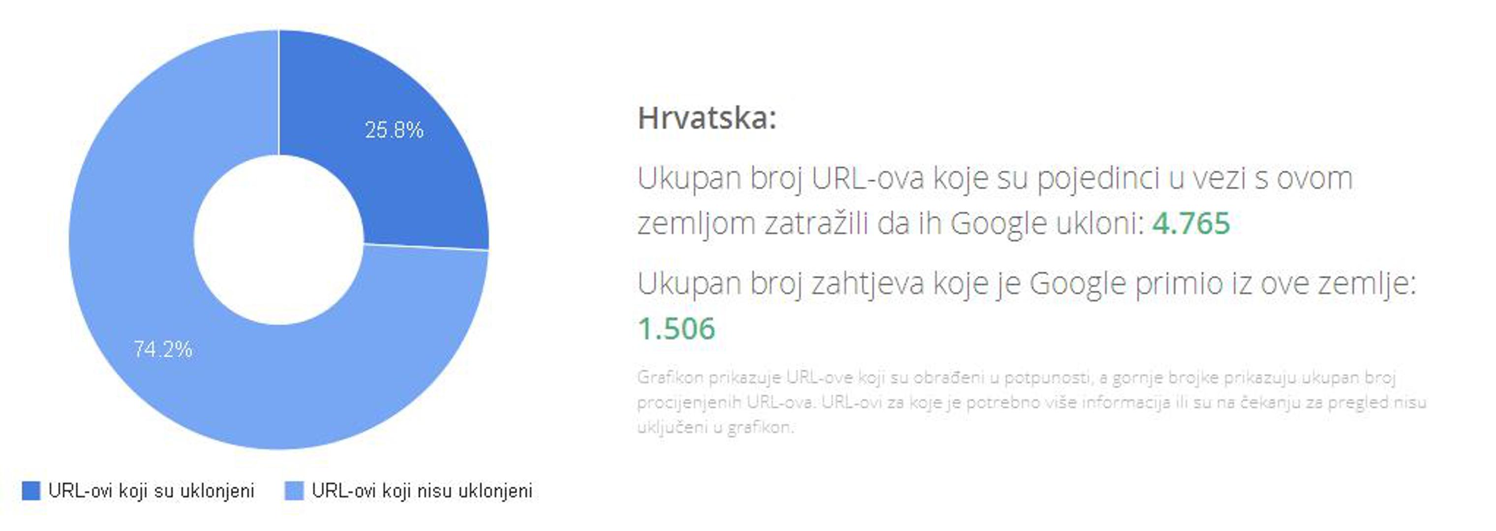 Zahtjeva povezanih s Hrvatskom bilo je 4765, dok je iz Hrvatske Google primio 1506 zahtjeva za brisanje. Čak 74.2% svih zahtjeva povezanih s Hrvatskom odbijeno je.