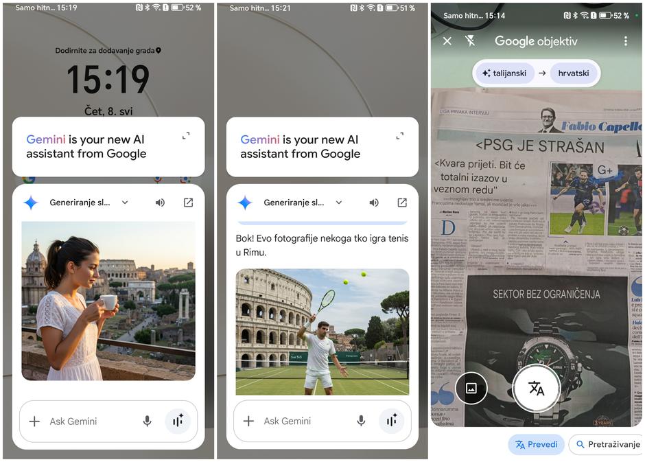 A da bi u potpunosti tipka zaslužila prozivanje AI značajkom može se duljim pritiskom aktivirati popularna aplikacija Google Lens koju pak možete koristiti za prepoznavanje nekih objekata dok ste na putovanju ili brzi prijevod jelovnika. Probao sam uz pomoć ove usluge čitati najpoznatije talijanske sportske novine La Gazzetta dello Sport. Nisam najbolje uspio sve prevesti što piše slavni nogometni stručnjak Fabio Capello o završnici Lige prvaka, ali jesam shvatio glavni naslov i poruku kako je mobitel i preveo: "PSG je strašan". U nogometnom žargonu doista jest...