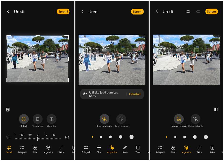 U galeriji fotografija izaberete koju fotografiju želite popraviti, u dnu sučeljava izaberite opciju "uredi", a potom izaberite "AI gumica", tada ćete dobiti poruku "nacrtajte krug oko objekta koji želite ukloniti" - i jednostavno prstom zaokružite 'sporni' detalj. Ovo funkcionira vrlo jednostavno i jako dobro. Uspješno mi je 'izrezivao' osobe iz kadra u različitim kompozicijama pa čak i kada su osobe blizu jedna do druge. A najbolje je što se stvarno ni ne primjeti da je nešto nestalo s fotografije. Značajka AI Outpainting pak omogućuje da proširite postojeću fotografiju dodavanjem šireg kadra koji "nadoštruka" postojeći pejzaž. Dakle, super za još impresivnije fotografije na mrežama...