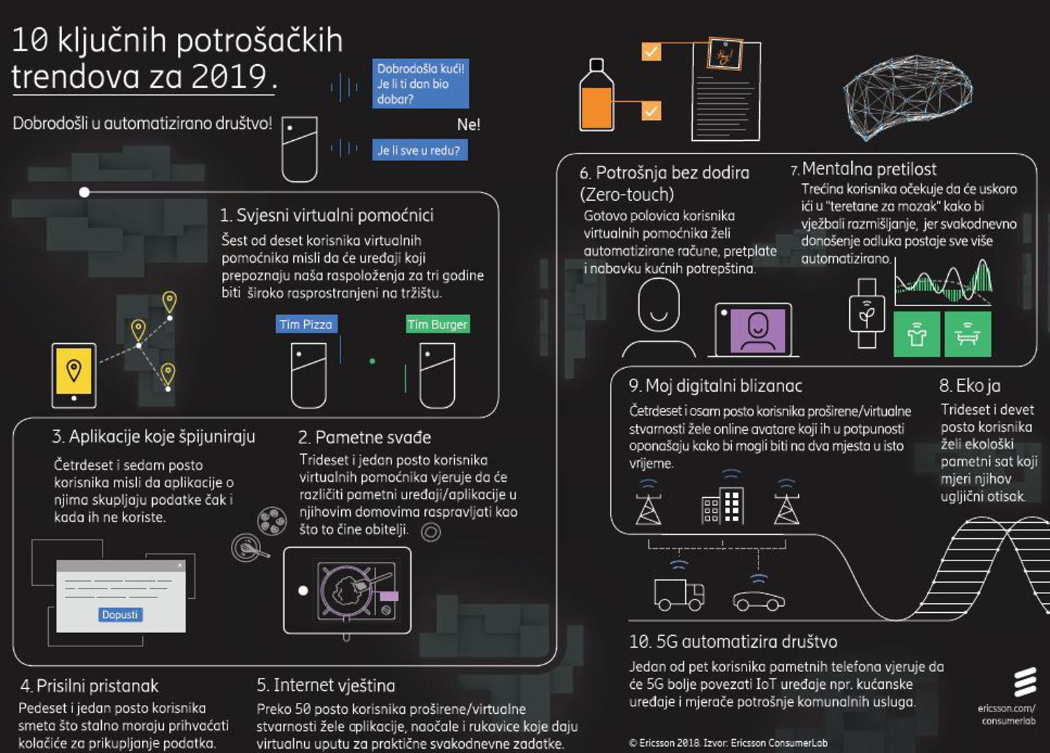 ConsumerLab izvješće objavljuju već osam godina, a temelje ga na razmišljanjima 5097 tehnološki osviještenih korisnika, urbanih ranih usvojitelja tehnologije iz deset svjetskih gradova. Pametno, jer na kraju je upravo korisnik taj koji definira trendove koje poslije prate korporacije poput Ericssona. Po Ericssonovu izvješću ova golema masa ispitanika smatra kako je ključna riječ u tehnološkim trendovima automatizacija. Taj pojam ne bi se smio u bliskoj budućnosti shvaćati na doslovan način, automatizacija temeljena na umjetnoj inteligenciji može imati sasvim posebno značenje.
