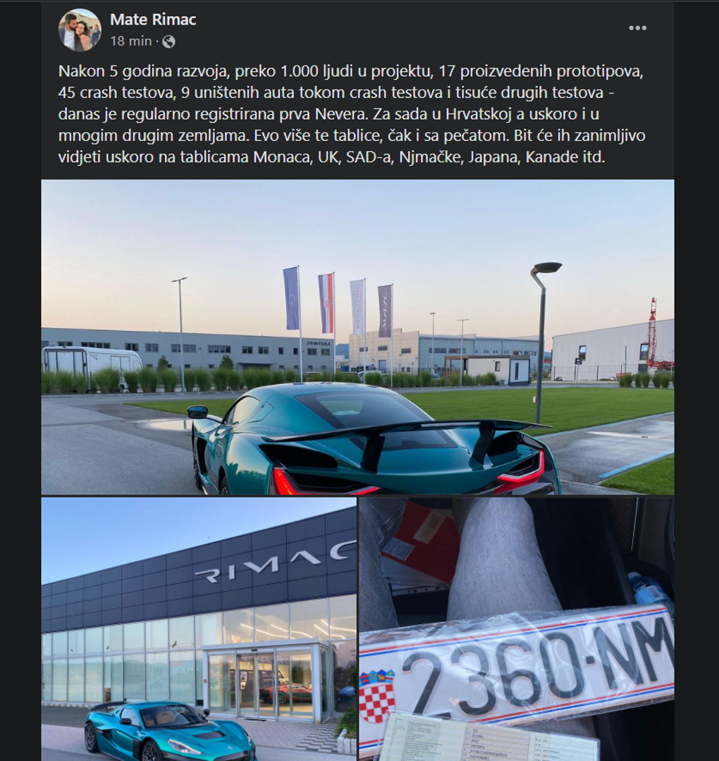 - Nakon 5 godina razvoja, preko 1.000 ljudi u projektu, 17 proizvedenih prototipova, 45 crash testova, 9 uništenih auta tokom crash testova i tisuće drugih testova - danas je regularno registrirana prva Nevera. Za sada u Hrvatskoj a uskoro i u mnogim drugim zemljama. Evo više te tablice, čak i sa pečatom. Bit će ih zanimljivo vidjeti uskoro na tablicama Monaca, UK, SAD-a, Njemačke, Japana, Kanade itd. - napisao je u Facebook objavi.