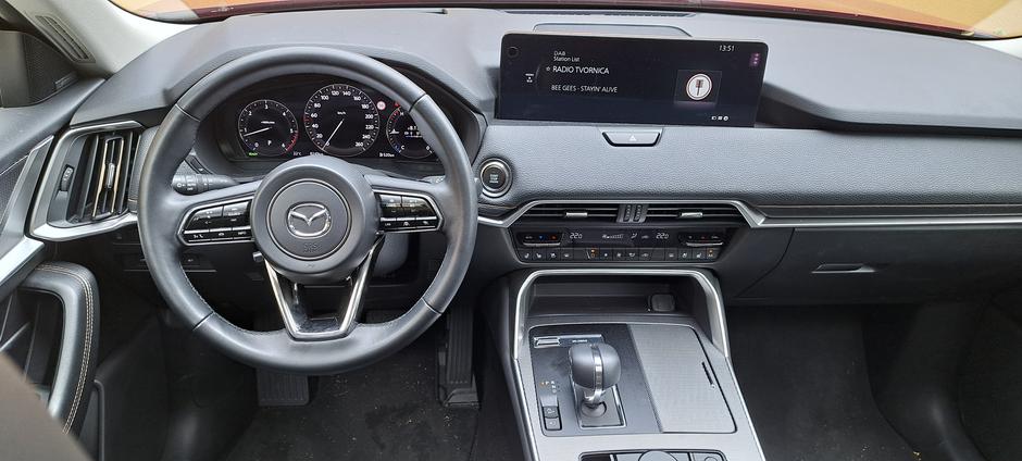 U unutrašnjosti su materijali i završna obrada na visokoj razini, uz 12" digitalnu instrumentnu ploču i 12,3-inčni položeni središnji zaslon u boji, čijim se funkcijama upravlja s pomoću okruglog kontrolera na središnjem grebenu. To je još jedno rješenje od kojeg Mazda ne odustaje iako je većina proizvođača prešla na dodirne zaslone. Funkcionira vrlo dobro, a sigurnije je. Do glavnih funkcija dolazi se preko fizičkih tipki smještenih na traci ispod ventilacijskih otvora što je također dobro rješenje.