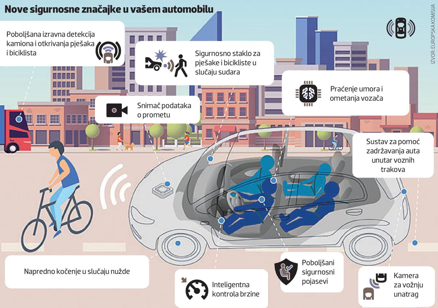 Vozilo će biti opremljeno kamerama koje će čitati prometne znakove pa će, kako kažu u Glavnoj upravi za promet, kad vozač stisne gas, papučica pružati otpor ako brzina vozila ide iznad dopuštene. Predviđena je obvezna ugradnja i sustava za praćenje budnosti i pozornosti vozača te sustava za detekciju pri vožnji unatrag