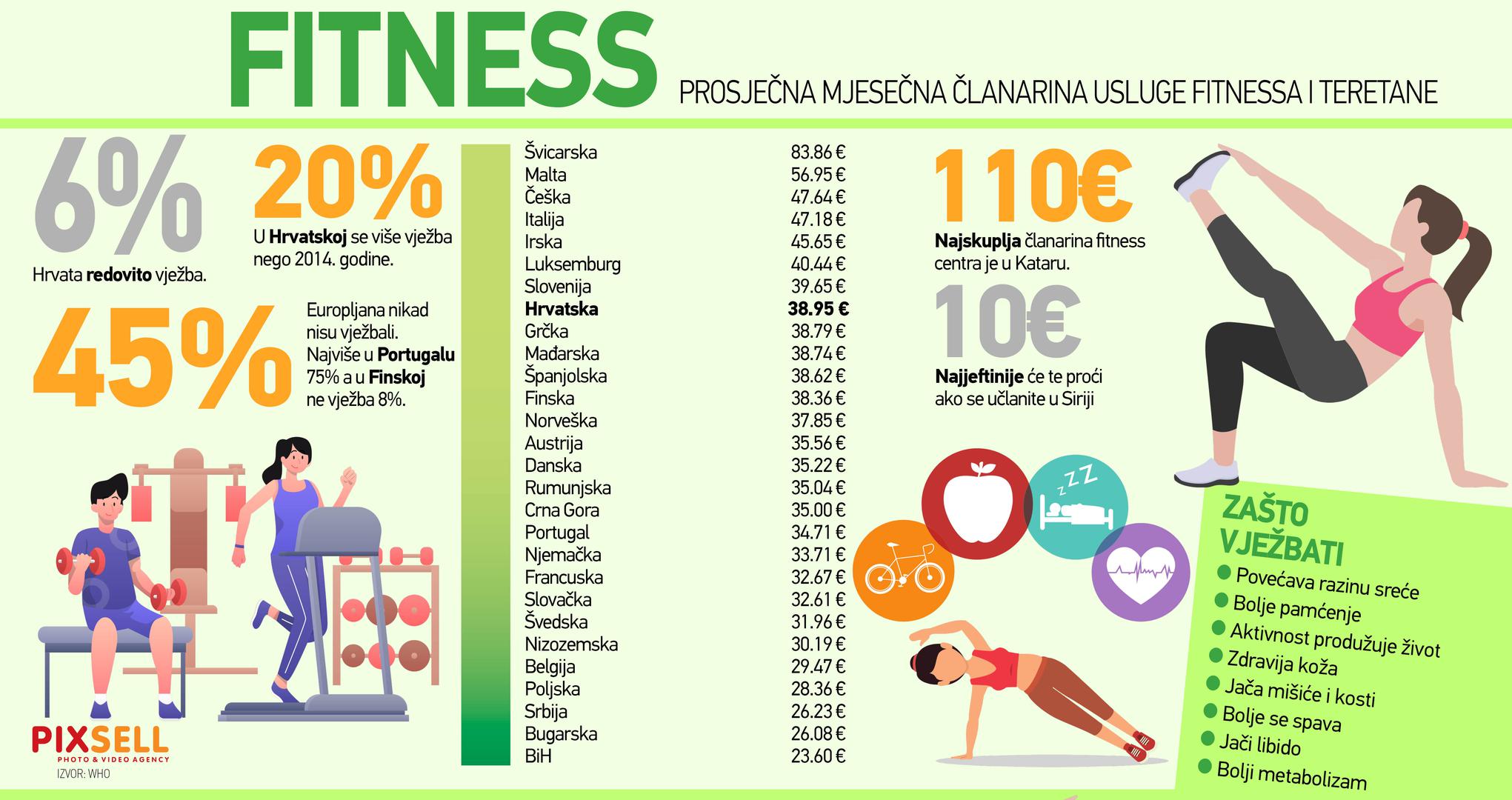 No, ako vam treba dodatan poticaj, ili jednostavno više volite taj ambijent, odlazak u teretanu dobra je opcija. Pixsell je infografikom objedinio informacije o cijeni prosječne mjesečne članarine u teretanama u europskim zemljama. Najskuplja je Švicarska s mjesečnom članarinom od oko 83 eura, slijede Malta s 57 eura i Češka s 47 eura. Hrvatska je također među skupljim zemljama, odmah iza Luksemburga i Slovenije, s prosječnom mjesečnom članarinom od oko 39 eura. Mjesečna članarina u teretanama od onih hrvatskih niža je čak i u Švedskoj, Nizozemskoj, Belgiji, Njemačkoj, Austriji…