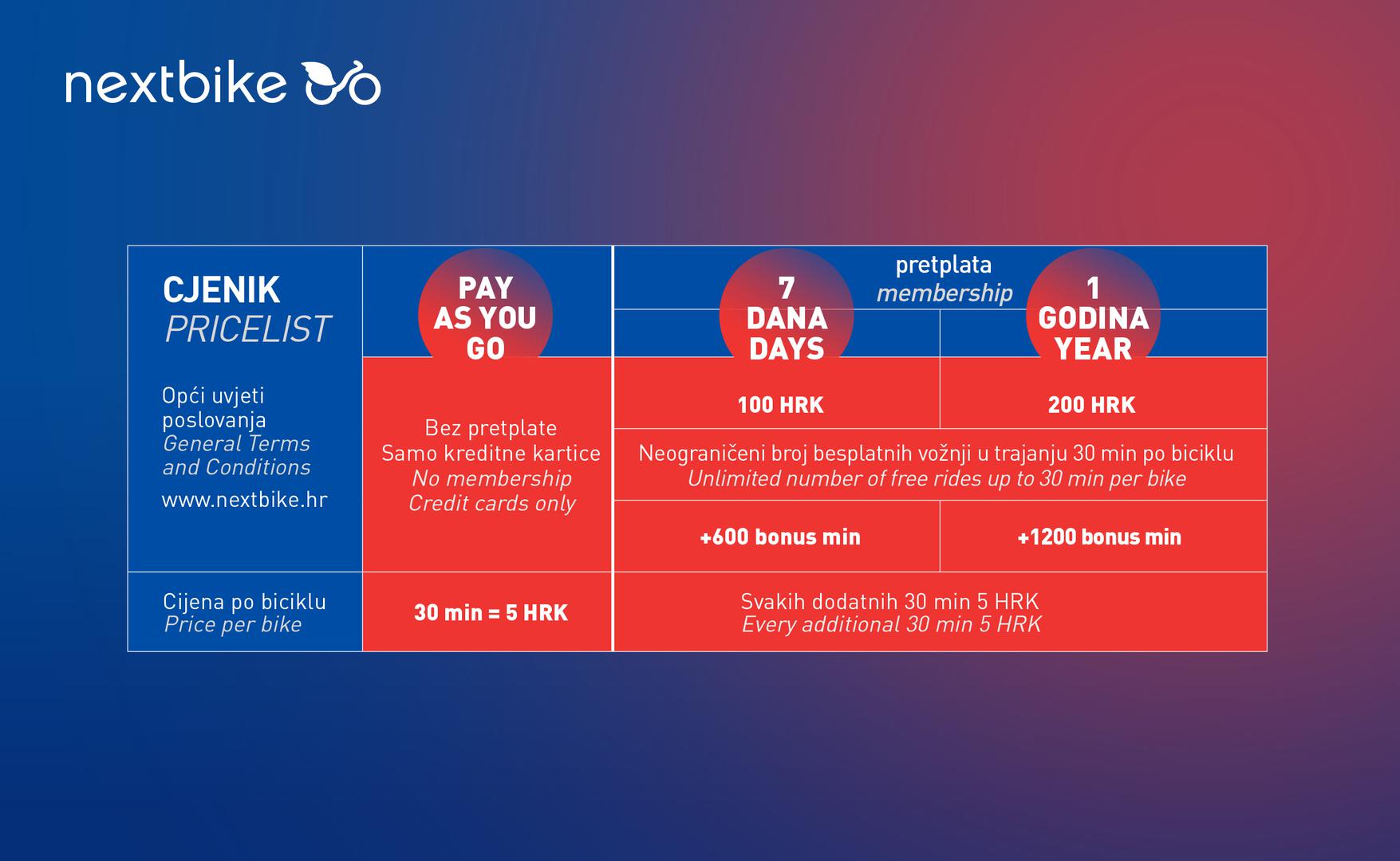 Nextbike građanima, studentima i turistima omogućava najpovoljniji, najbrži, najzdraviji i najzabavniji prijevoz, a jednom registrirani korisnik za samo 200 kuna godišnje članarine nextbike bicikle može koristiti u više od 150 gradova u svijetu! Za turiste tu je 7-dnevni paket za samo 100 kuna, a Pay As You Go opcija omogućuje najmove bicikala u trajanju do 30 minuta za samo 5 kuna.