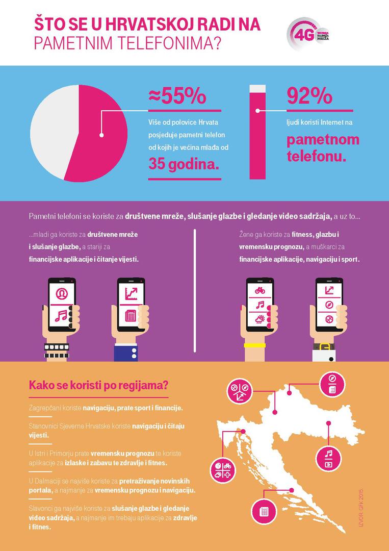 Internet na mobilnom uređaju koristi 92 posto vlasnika pametnih telefona, a među njima gotovo 30 posto već je prešlo na 4G internet. Gotovo 70 posto korisnika surfa na smartphoneu više od 30 minuta na dan, a među mlađima od 24 godine čak 91 posto. Četiri petine ispitanika koristi internet i izvan kuće, pritom koristeći isključivo 3G/4G mobilni pristup ili kombinirajući mobilni pristup i fiksne pristupne točke. Mobilni internet najviše se koristi za društvene mreže i za surfanje internetom (više od 45 posto) te za gledanje videozapisa i slušanje glazbe te slanje i primanje elektroničke pošte (32 posto).