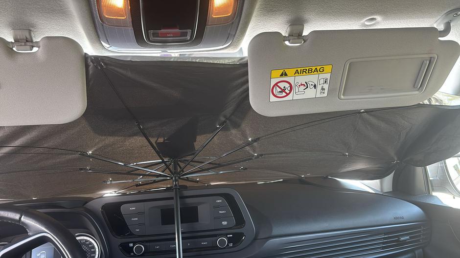 Radi se o suncobranu dizajniranom poput klasičnog kišobrana, ali s aluminiziranom površinom koja reflektira sunčeve zrake i zadržava ugodnu temperaturu unutar vozila. Postavljanje je izuzetno jednostavno, samo ga otvorite kao običan kišobran i prislonite na unutrašnju stranu stakla. Za razliku od klasičnih sjenila, ovaj model ne propada, ne gužva se i ne zauzima puno prostora kad se ne koristi, jednostavno se sklopi i spremi u pretinac.