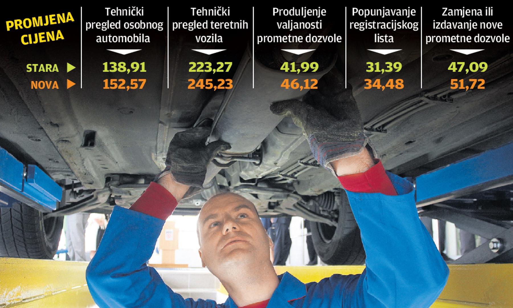 Nova cijena popunjavanja registracijskog lista je 34,48 kuna, dok je stara iznosila 31,39 kuna. Pregled vozila radi promjene tehničkog stanja (boja, šasija, kuka...) odsad stoji 49,57 kuna, a dosad se ta usluga plaćala 45,13 kuna.