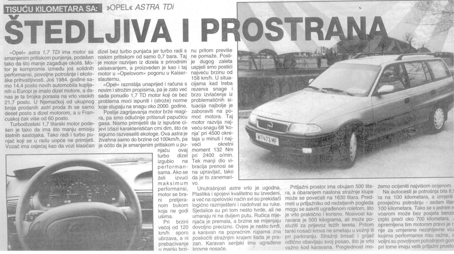 Astra je jedan od najpopularnijih automobila u Hrvatskoj, danas već u petoj generaciji, a prva se pojavila 1991. godine, kao zamjena za također jako popularni Kadett. U testu iz 1996. godine isprobali smo izvedbu s turbodizelskim motorom, koji, kako je zabilježio naš novinar, predstavlja kompromis između još solidnih performansi, povoljne potrošnje i ekološke prihvatljivosti.