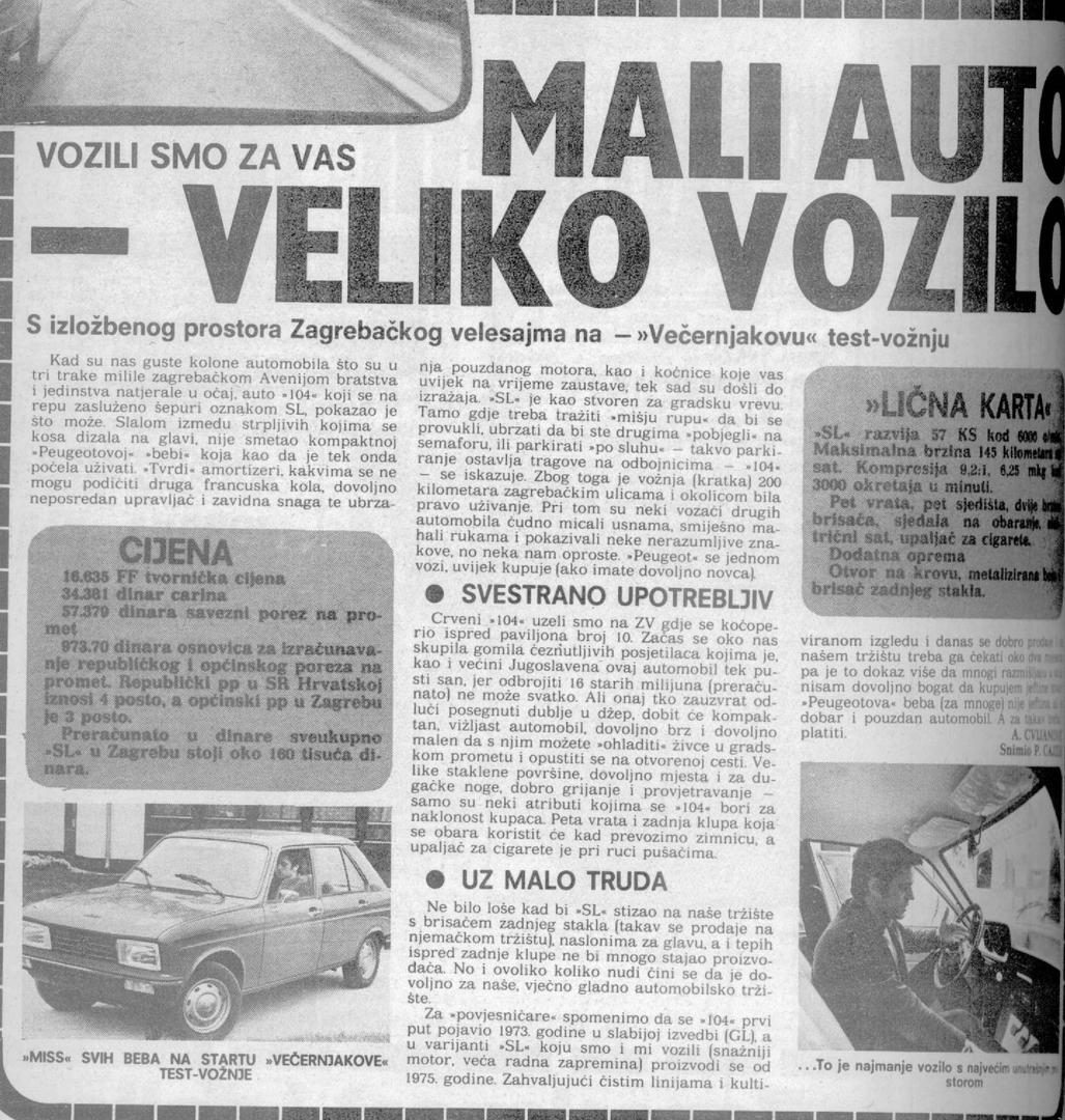 Jedan od takvih bio je i Peugeot 104 SL, koji je Večernji testirao 1978. godine. Iako je riječ o relativno malenom i skromnom autu, tada najmanjem Peugeotu (pa je zaradio i nadimak "beba"), čini se da je mnogima u to vrijeme bio nedostižan. Ono što u ovom starom testu odmah upada u oči je cijena - točnije, da su carina i savezni porez na promet iznosili više od polovice ukupne cijene automobila, koja je bila oko 160.000 dinara. Bio je to jedan od načina zaštite tadašnje domaće autoindustrije.