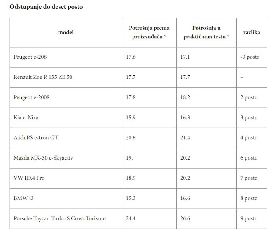 U slučaju potrošnje dizelaša i benzinaca WLTP se pokazao mnogo točnijim, ali kod mnogih modela i dalje ima odstupanja, odnosno brojke na testu su mnogo bolje nego u stvarnosti. Kako je s električnim automobilima? Isto, rekli bismo, a samo su dva vozila u stvarnim uvjetima trošila kao i na WLTP testu ili čak manje od toga. To su Peugeot e-208 i Renault Zoe.
