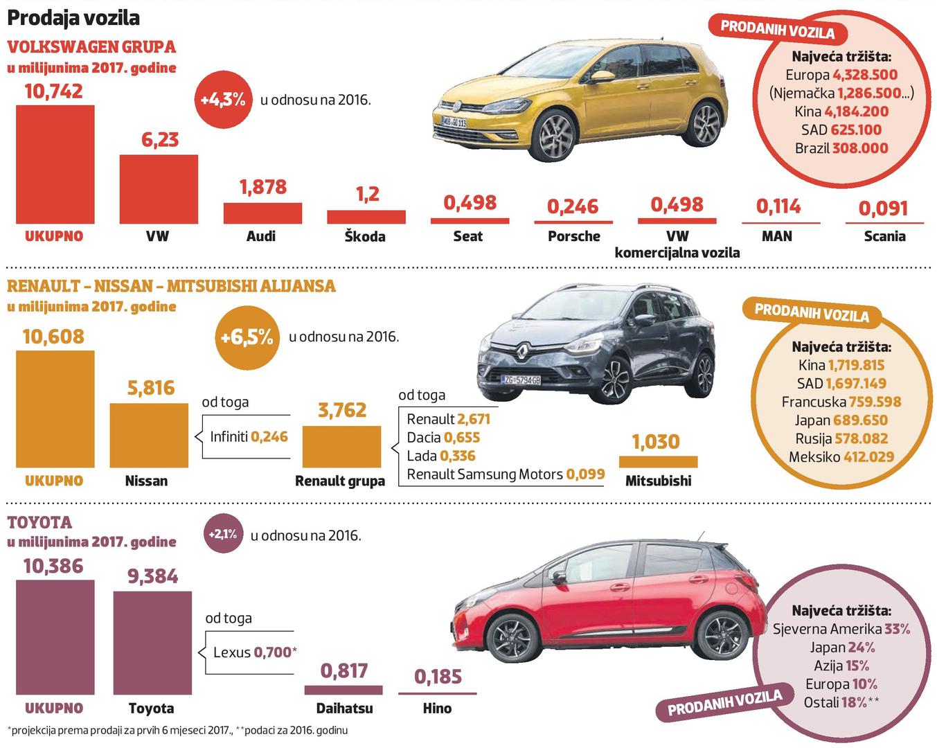 Tko je - po rezultatima iz 2017. godine - najveći proizvođač automobila na svijetu? Odgovor na to pitanje ovisi o tome broje li se samo osobni automobili, ili automobili i laka komercijalna vozila ili se njima pribrajaju i teretna vozila. Tako se svaka od tri vodeće grupacije hvali brojkama koje njima idu u korist, a sva su tri megaproizvođača zabilježila rast prodaje.