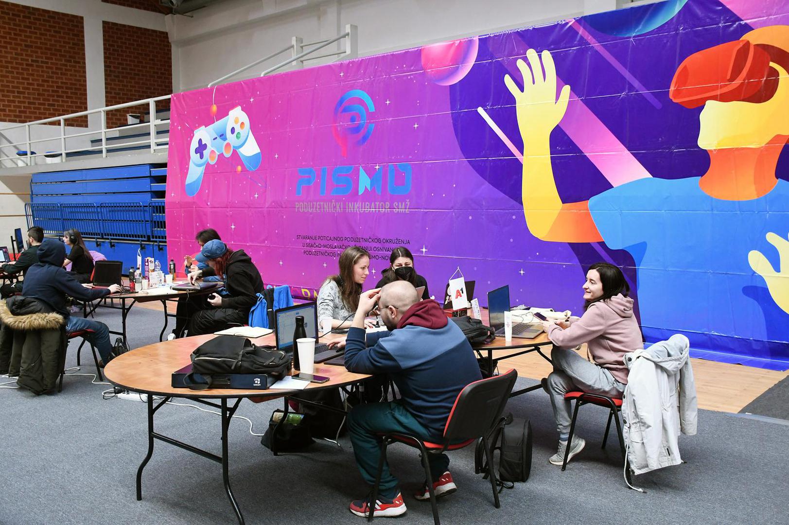 29.01.2022., Novska - U organizaciji Poduzetnickog inkubatora PISMO pocelo jos jedno izdanje Global Game Jam-a, natjecanja u izradi videoigara koje se odrzava na svjetskoj razini, i to na 648 lokacija diljem svijeta. U Hrvatskoj se već tradicionalno održava u sportskoj dvorani u Novskoj gdje vise od 100 natjecatelja, podijeljenih u ekipe, pokusava stvoriti video igru u propisanih 48 sati. Photo: Nikola Cutuk/PIXSELL