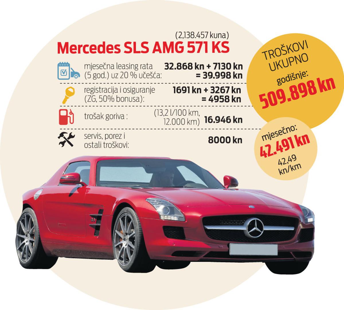 Ali, da ima i onih koji si mogu priuštiti superluksuzne automobile, 35 puta skuplje od spomenutog gradskog Peugeota 107, pokazuje i primjer najskupljeg auta u našoj usporedbi. Supersportski Mercedes SLS AMG sa 571 KS, vrijedan 2,138.457 kuna, kakvog vozi šibenski poduzetnik Josip Stojanović Jolly, uz leasing i redovne troškove godišnje vlasnika stoji 509.898 kuna ili 42,49 kuna po kilometru.