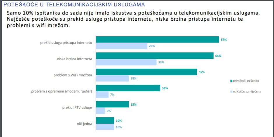 Kada se radi o teškoćama u telekomunikacijskim uslugama, samo 10 posto korisnika nije ih iskusilo. Najčešće teškoće su prekid usluge pristupa internetu što je primijetilo 67 posto ispitanika, nisku brzinu pristupa internetu uočilo je 64 posto ispitanih, probleme s Wi-Fi mrežom 55 posto, teškoće s opremom (modem, router) 35 posto, a prekid IPTV usluge 18 posto korisnika.