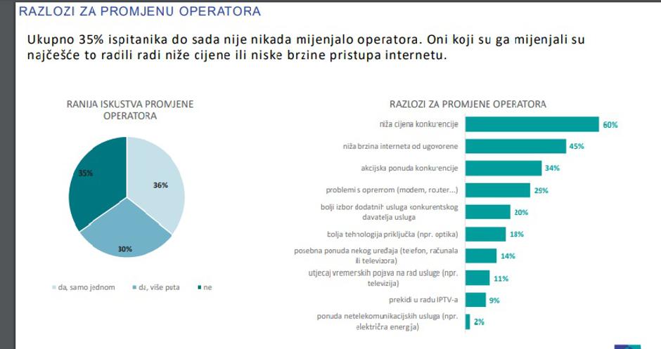 Kada se radi o razlozima za promjenu operatora, 35 posto ispitanika nije nikada mijenjalo operatora. Oni koji su ga mijenjali najčešće su to radili radi niže cijene ili niske brzine pristupa internetu. Ponuda konkurencije ima manji učinak na odluku korisnika o promjeni operatora – minimalna promjena cijene trenutačnog operatora (od 10 posto) vjerojatno će ih potaknuti na promjenu, pokazali su podaci HAKOM-a.