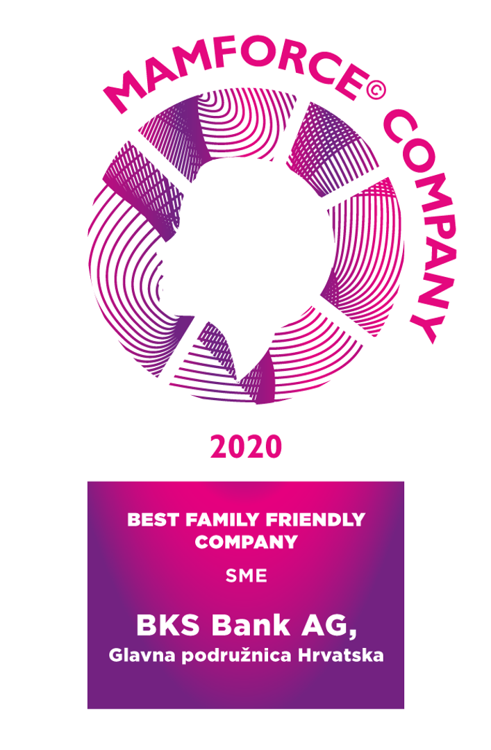 Širok raspon pogodnosti za usklađivanje poslovnog i obiteljskog života. Stoga je danas MAMFORCE © odabrao BKS Bank među SME tvrtkama kao najboljom u kategoriji Family friendly. Tim povodom je Diana Kolbas Desković u ime tima za dodjelu izjavila: “Najbolje kompanije prijatelji obitelji aktivno brinu o potrebama svojih zaposlenih tijekom i izvan radnog vremena. U BKS Bank svim zaposlenima su na raspolaganju različiti, izrazito fleksibilni radni aranžmani među kojima se ističe inovativna praksa nepunog radnog vremena nakon roditeljskog dopusta, a među brojne pogodnosti za roditelje uvedene je i mogućnost korištenja „pauze u karijeri“ uz garantirani povratak na isto radno mjesto.