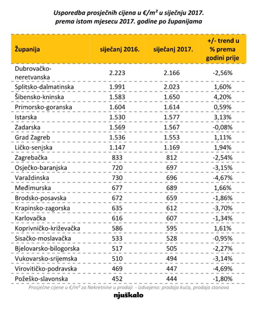 U siječnju 2017. godine po najvećim gradovima u Hrvatskoj, ne uključujući i njihovu okolicu, najviše cijene po kvadratu imaju nekretnine u gradovima na Jadranu – u Dubrovniku, Splitu i Zadru. Najnižu prosječnu cijenu nekretnine i dalje ima grad Vukovar, u kojemu je cijena kvadrata 426 eura. Od najvećih gradova u Hrvatskoj najveći pad cijena nekretnina pokazuje Vukovar s padom od 14 posto na godišnjoj razini te Bjelovar s padom od 6 posto. Dubrovnik je i dalje najskuplji grad s godišnjim rastom cijena nekretnina od deset posto, a slijede ga Opatija i Hvar.