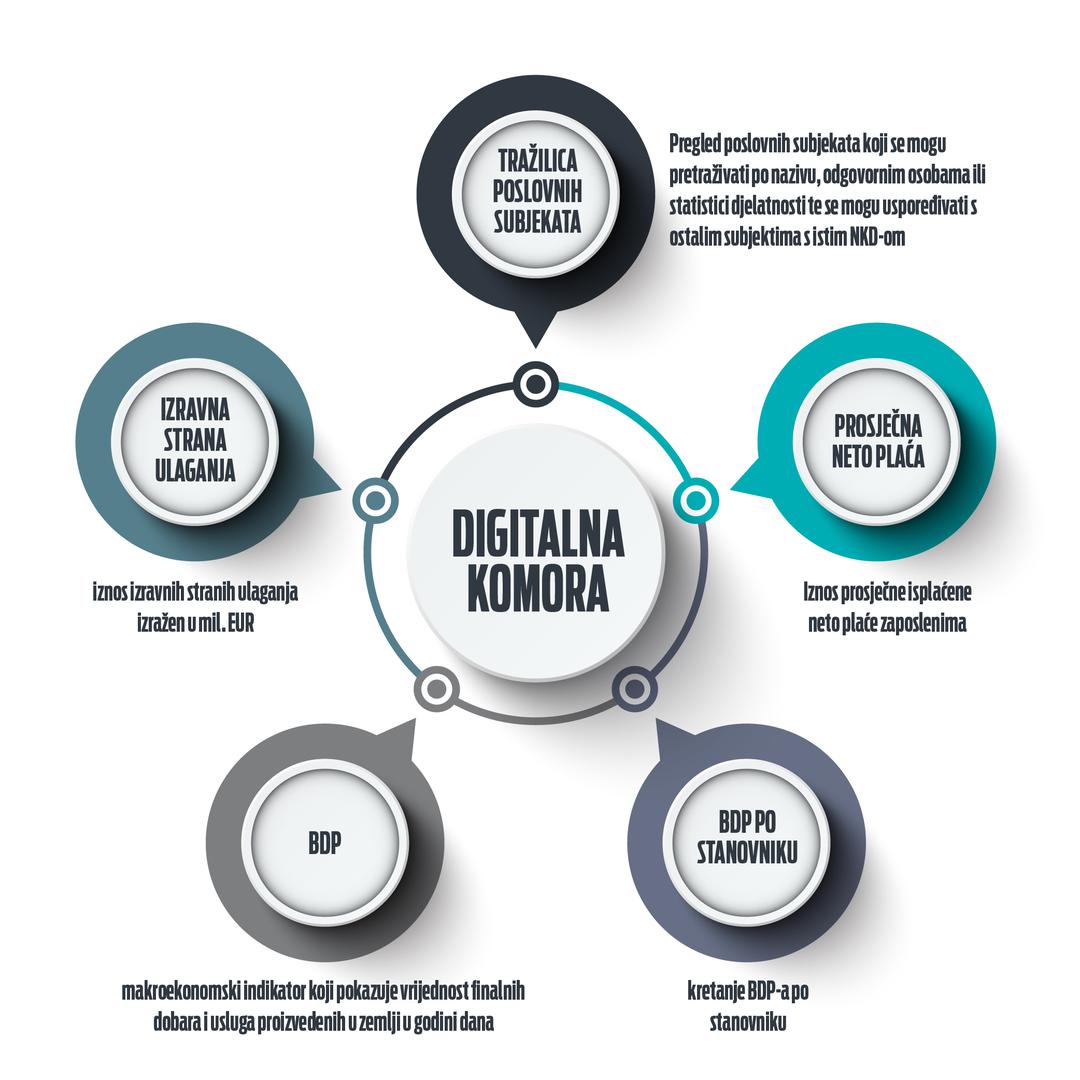 U ovoj prvoj fazi, korisnicima je dostupna prva usluga - Gospodarska mreža, platforma na kojoj su mogu na jednom mjestu dobiti uvid u makroekonomske pokazatelje na razini Hrvatske i pojedinih županija, pokazatelje realnih stopa rasta i inflacije, broj aktivnih poslovnih subjekata, broj zaposlenih i bruto inozemni dug. Korisnicima Digitalne komore na raspolaganju je i tražilica poslovnih subjekata – za koje su dostupni osnovni podaci te aktualni financijski pokazatelji i analiza poslovanja. Poslovni subjekti mogu se pretraživati po nazivu, odgovornim osobama ili statistici djelatnosti te se mogu uspoređivati s ostalim subjektima s istim NKD-om.