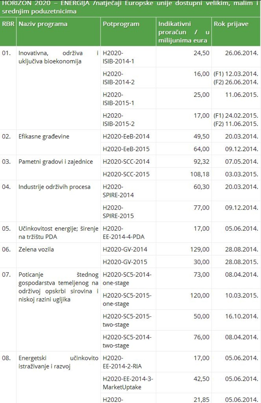 Europska unija, u okviru HORIZON 2020 - ENERGIJA, raspisala je 8 natječaja za bespovratna financiranja projekata, između ostalih, velikih, srednjih i malih poduzetnika, a na koje se mogu prijaviti i hrvatski poduzetnici. Indikativni proračun svih otvorenih natječaja iznosi 1,17 milijarde eura, piše portal Croenergo.eu.