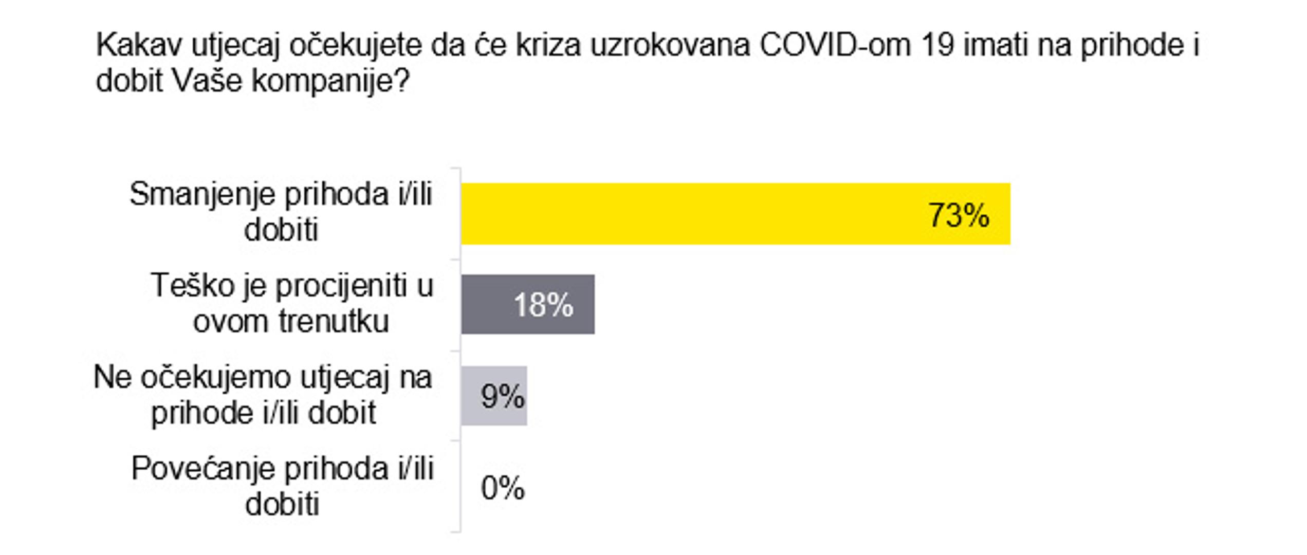 Na pitanje koliko su trenutno pogođeni krizom uzrokovanom COVID-om 19, ispitanici u najvećem postotku odgovaraju kako očekuju utjecaj na određene dijelove poslovanja i detaljno ih prate (61 posto), dok 30 posto njih očekuje značajan utjecaj na poslovanje, zbog čega su veoma zabrinuti. Nadalje, 73 posto ispitanika očekuje smanjenje prihoda i/ili dobiti kao posljedicu krize.