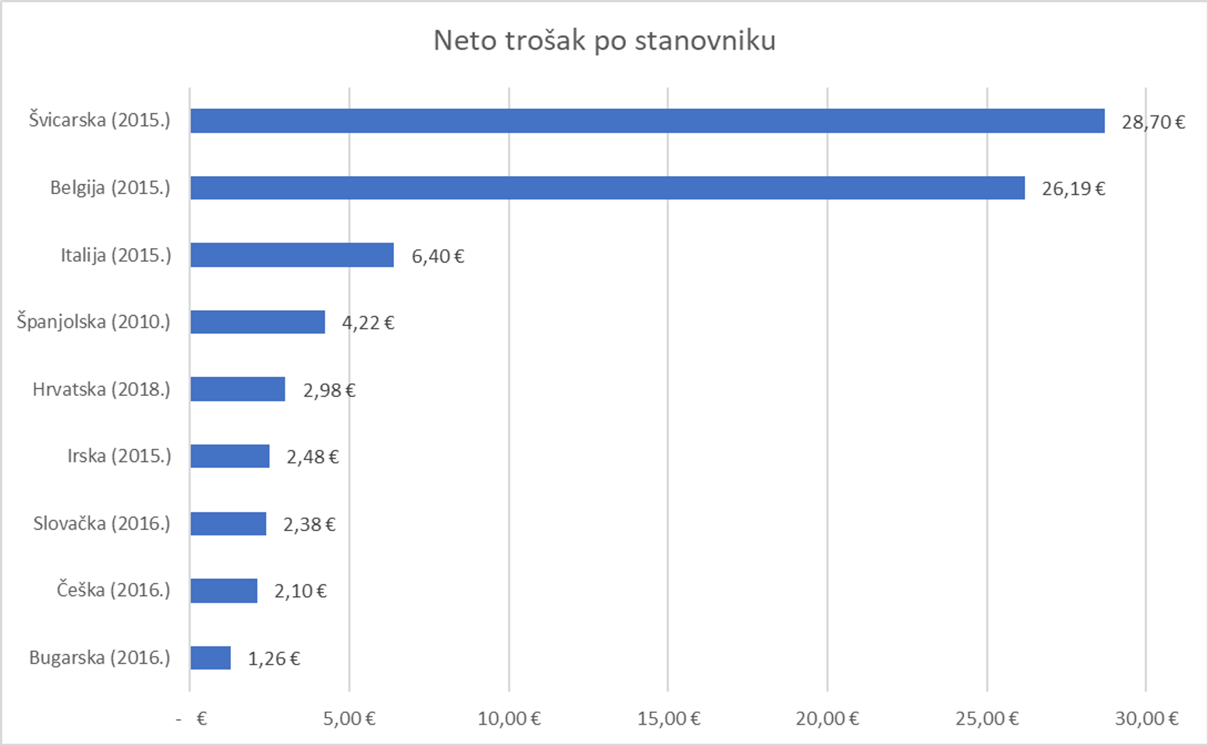 Prema službenim podatcima iz 2018. neto trošak po stanovniku u Hrvatskoj iznosi 2,9 eura, što je niže od prosjeka EU, a usporedbu sa nekim članicama EU može se vidjeti u tablici: