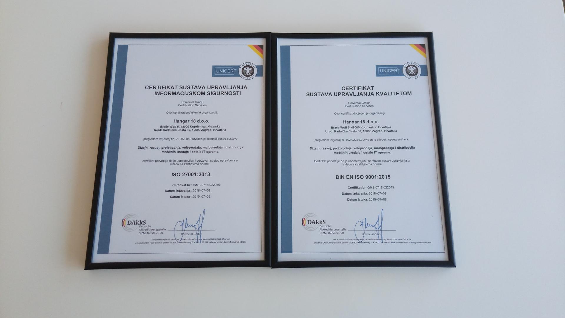 ISO certifikacija je već dugi niz godina jamstvo kvalitete i indikator uspješnosti poslovanja. Uz pomoć metodologije i resursa koji su uključeni u proces certifikacije tvrtke dobivaju mjerljive rezultate, te poboljšavanjem vlastitog standarda pospješuju profit i povećavaju zadovoljstvo krajnjih korisnika. Nakon godine dana intenzivnog rada možemo reći da je Hangar 18 uspio dobiti potvrdu kvalitete i uspješnosti dosadašnjeg rada i postaviti temelje daljnjem unapređenju naše djelatnosti.