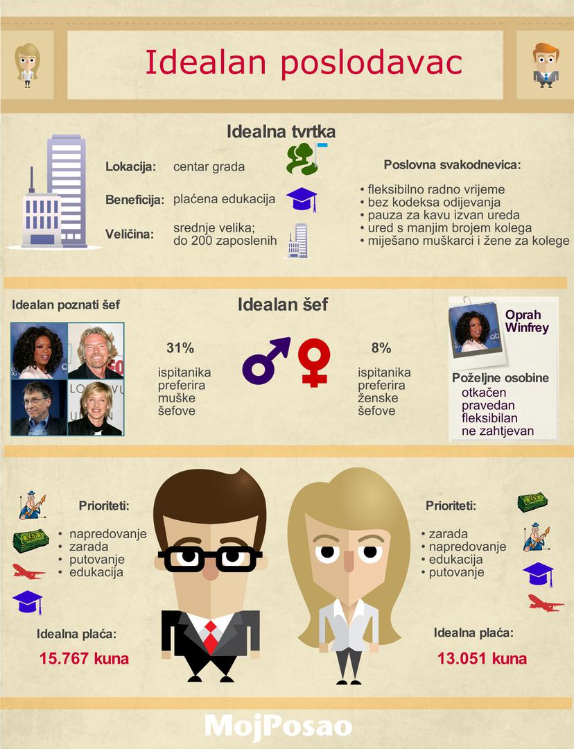 Idealan posao je onaj koji će ispitanicima prvenstveno omogućiti zaradu (35%), a zatim napredovanje (23%). Poslovna putovanja si priželjkuje 17% ispitanika, a edukaciju njih 13%. Za 2% ispitanika idealan posao je onaj koji će im donijeti i slavu. Ispitanici također navode da bi idealan posao trebao pružiti radost i samoostvarenje.