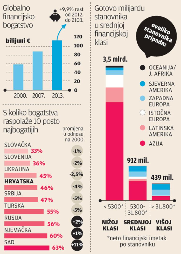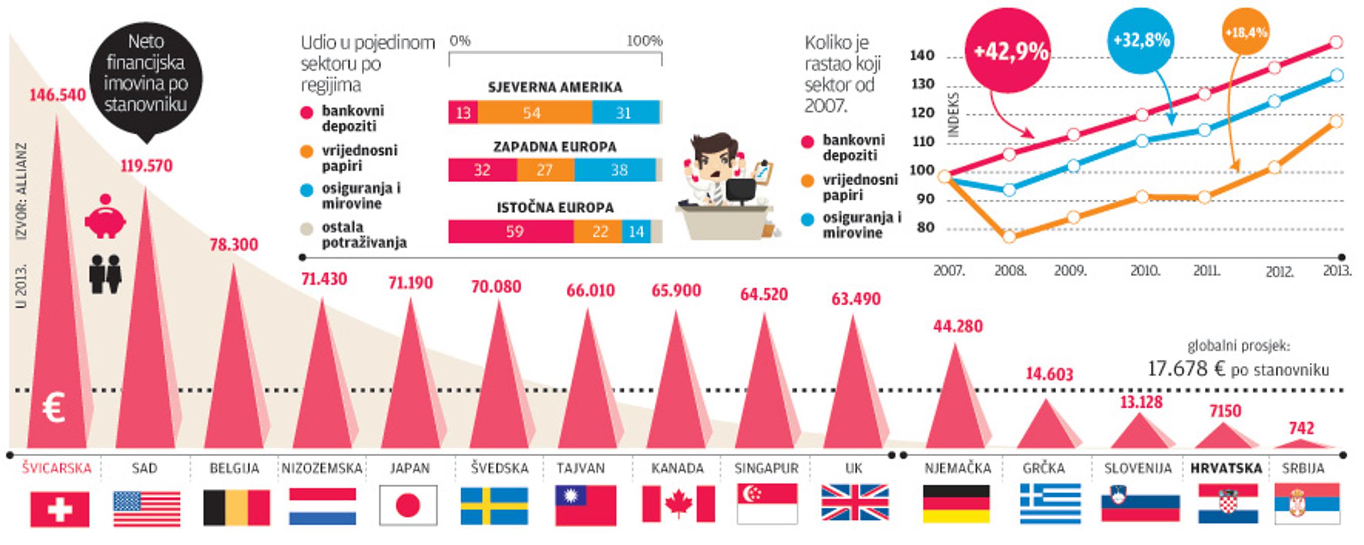 Najbogatiji su Švicarci sa 146.540 eura neto financijske imovine, a među tri najsiromašnije zemlje je Srbija s imovinom od 742 eura. Prosječan Hrvat 20 puta je siromašniji od Švicarca, a 10 puta bogatiji od Srbina. Zanimljivi su i trendovi kretanja bogatstva. Hrvatski građani povećali su svoju imovinu u 2013. tek 5,4 posto, što je sporije od građana u regiji. Razlog tomu možda je i u činjenici da gotovo 58 posto financijske imovine građana Hrvatske leži u bankama, a tek 17 posto građana spremno je uložiti u vrijednosne papire, koji uglavnom nose veći profit.