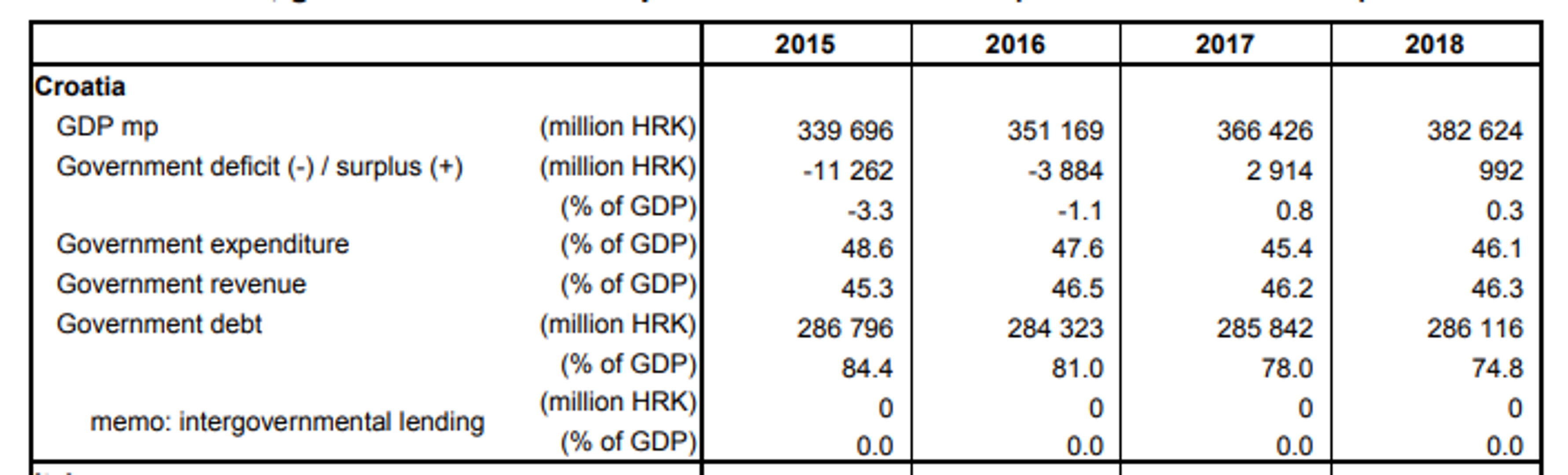 Hrvatska je u 2018. godini imala višak u proračunu opće države od 992 milijuna kuna ili 0,3 posto BDP-a, pokazalo je najnovije izvješće. Prva procjena Eurostata za 2018., objavljena u travnju, pokazivala je višak od 0,2 posto BDP-a. U 2017. godini višak je iznosio 0,8 posto BDP-a.