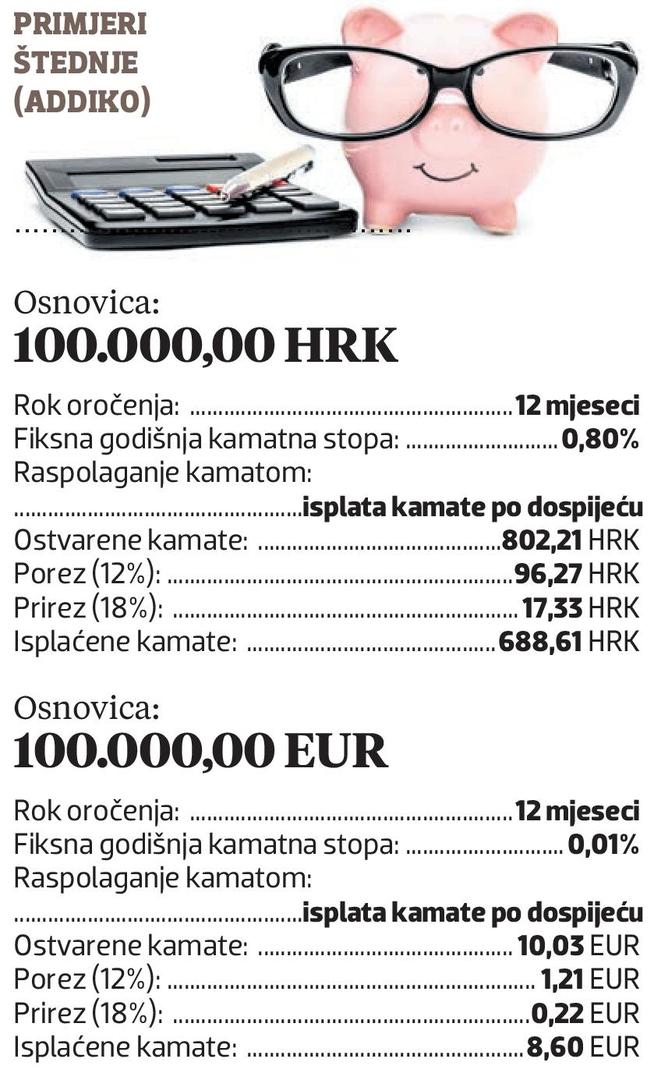 Ukupni depoziti građana u Addiku iznose 1,3 mlrd. eura, a u kunama je oko 30 posto štednje. Na kunsku štednju kamate im variraju od 0,8 do 1,1 posto, na eursku od 0,01 do 0,02 posto. Štednju s premijom imaju kod minimalnih mjesečnih ili kvartalnih uplata od najmanje 200 kuna ili 30 eura.