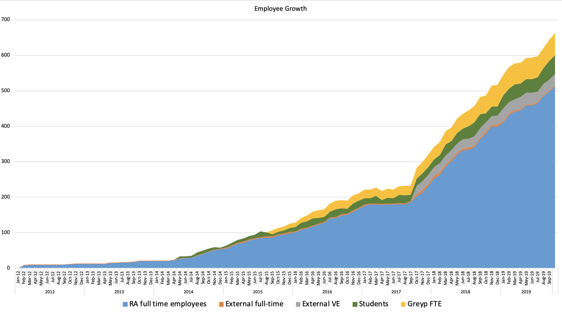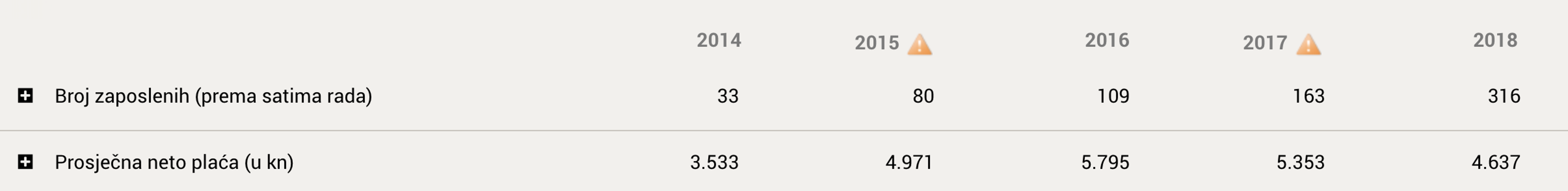 Osim dezinformacije o prosječnoj plaći je i način o računanju broja zaposlenih za firmu poput RA potpuno neadekvatan. FINA računa broj zaposlenih na temelju ukupnog broja radnih sati u jednoj godini. Za tvrtke koje, poput RA, brzo rastu – taj podatak nema veze s realnim stanjem. RA su u 2018. godinu ušli s 232 stalno zaposlena a zaključili godinu s 399 (vidi sliku ispod) dok u FINA-inim izvještajima stoji da imamo 316 zaposlenih. Krajem listopada imali smo 513 stalno zaposlena + 83 studenta i vanjskih suradnika. Uz kolege iz Greypa smo na 665 – ne brojeći naše zaposlenike u JV-u u Kini. Dakle RA i Greyp imaju preko 575 stalno zaposlenih te 93 studenata i vanjska suradnika, dok će na raznim portalima stajati sasvim druge brojke. Za ovaj slučaj razumijem da FINA i druge institucije ne mogu prilagođavati svoje sustave i procese anomalijama poput RA, no želim ukazati na to da brojevi na tim portalima nisu relevantni za mnoge brzorastuće tvrtke, pogotovo ako ulažu u R&D. Ovo nije samo problem za RA, nego i za mnoge druge tehnološke i brzorastuće tvrtke – problem koji bi trebalo biti relativno lako otkloniti.