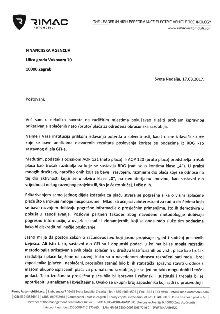 "Unatoč tome tvrtke koje ulažu u R&D zakinute su. Svi izdaci za razvoj MORAJU se knjižiti pod nematerijalnu imovinu – gdje se takvi izdaci akumuliraju dok ne kreće eksploatacija te investicije. Takav način knjiženja nije naš hir niti nam daje ikakve prednosti u operativnom poslovanju (i dalje plaćamo pune doprinose na te plaće itd.) – to je jednostavno pravilo bilo gdje u svijetu – kod nas je i propisano zakonom. U našem slučaju svi se troškovi za razvoj automobila ili drugih sustava koje razvijamo knjiže na nematerijalnu imovinu, dok ne krenu prihodi od tih proizvoda – što u slučaju razvoja automobila može biti 5 ili više godina. U slučaju C_Two to će biti oko 100 M eura investicije (plaće, prototipovi, alati, testiranja…). Kada krene isporuka kupcima, kreće i amortizacija akumuliranih troškova. U te troškove spadaju i plaće ljudi koji rade na razvoju, što čini veliki dio naših zaposlenih. Isplaćene plaće knjižene na taj način FINA ne uzima u obzir prilikom izračuna prosječne plaće u poduzeću, dok uzima u obzir broj ljudi (ne isključuje ih brojčano iz izračuna – dakle svaki zaposlenik koji radi na R&D doprinosi umjetnom smanjenju prosječne plaće u statistici).