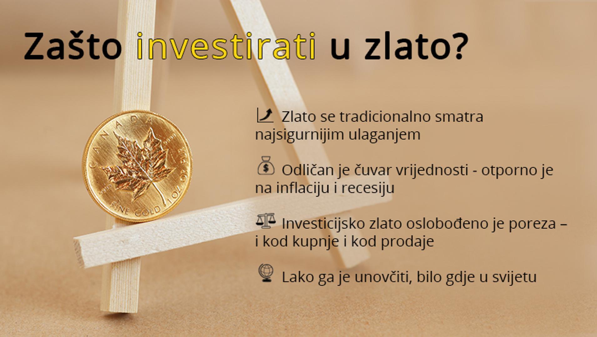 Od svih opcija ulaganja u zlato najboljom se smatra kupovina zlatnih poluga i zlatnika odnosno investicijskog zlata. Ova je vrsta ulaganja dostupna velikom broju ljudi jer se u ponudi na tržištu nalazi izuzetno širok raspona proizvoda – od pločica od 1 grama do poluge težine 1 kilogram. Također, proces kupovine je maksimalno pojednostavljen, kako u poslovnicama, tako i putem web shopa. Ulagači u investicijsko zlato oslobođeni su plaćanja poreza, a poluge i zlatnike lako je prenositi te čuvati odnosno skladištiti. Dodatna vrijednost investicijskog zlata je i njegova visoka likvidnost. Može se lako unovčiti svugdje u svijetu, što osobito vrijedi za proizvode poznatih svjetskih kovnica.