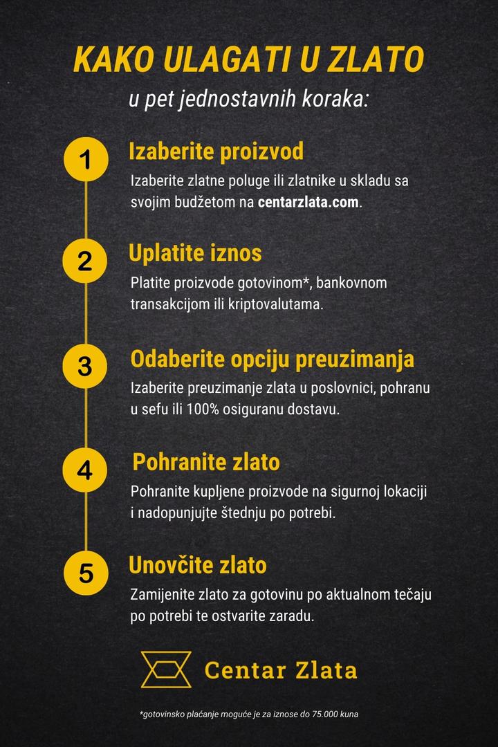 Ulaganje u zlato moguće je na više načina, a onaj najisplativiji i najsigurniji je kupnja zlatnih poluga i zlatnika koji se smatraju investicijskim zlatom kod vjerodostojnog trgovca plemenitih metala. Najpoznatiji takav trgovac u Hrvatskoj je Centar Zlata koji je ujedno i ovlašteni distributer poznatih europskih talionica kao što je austrijska državna kovnica Münze Österreich poznata po kovanju dukata s licem cara Franje Josipa te bečkih filharmoničara, najraširenijih europskih zlatnika.