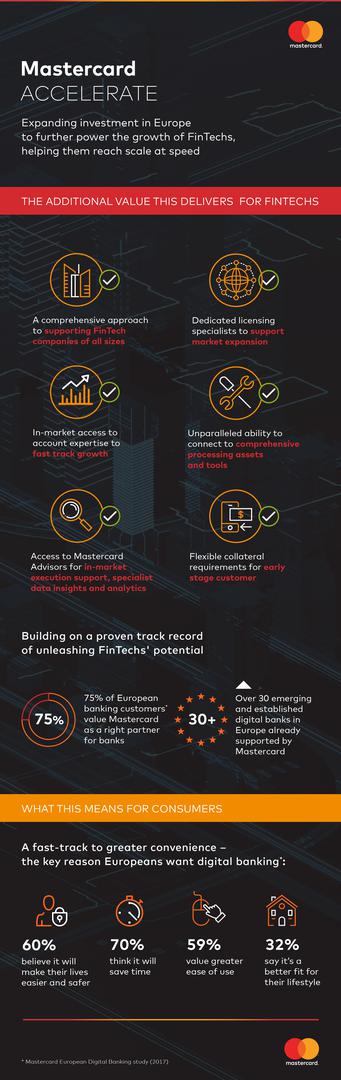 Mastercard je pokrenuo novu inicijativu Accelerate koja će doprinijeti širenju i daljnjem rastu brzo razvijajuće fintech industrije koja predstavlja i jedno od područja kojima je kompanija posvećena. Inicijativa je osmišljena kako bi podržala ciljeve fintech tvrtki, i to kroz prilagođene programe podrške koji uključuju pristup uvidu, alatima, tehnologiji i investicijama za potporu inovacijama. Osmišljena tako da funkcionira paralelno s uspješnim programom StartPath, inicijativa Accelerate proširuje i produbljuje angažman kompanije u fintech zajednici, uključujući i iduću generaciju digitalnih banaka.