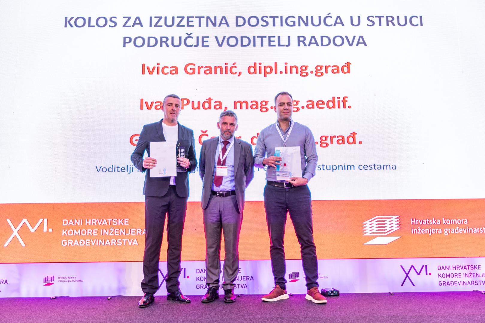 Ivica Granić, dipl.ing.građ. , Ivan Puđa, mag.ing.aedif. I Gordan Čelar, dipl.ing. građ. dobitnici su nagrade za izuzetna dostignuća u struci voditelja radova I to kao voditelji radova na projektu izgradnje mosta kopno-Pelješac s pristupnim cestama