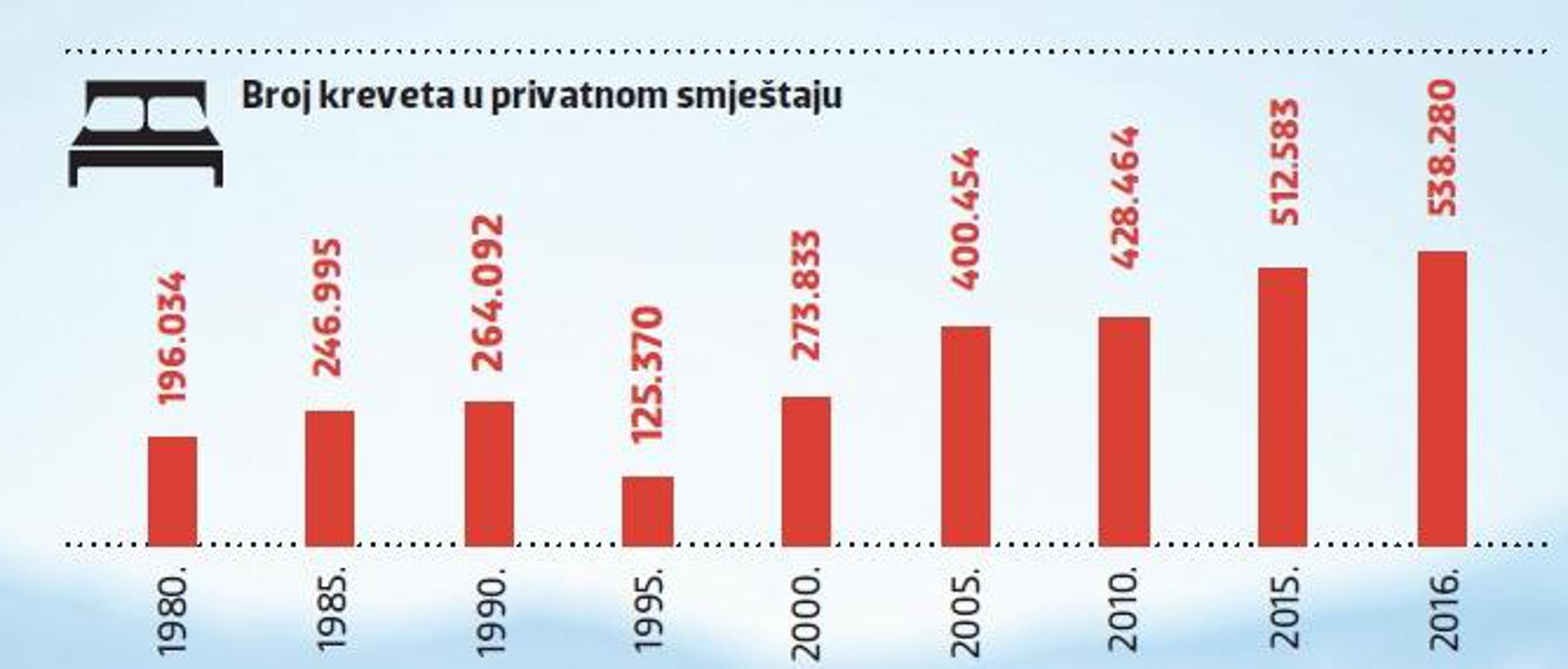 Zimmer frei od 1990. do danas udvostručio se. S prijeratnih 264.000, porastao je na čak 538.280 kreveta u 2016., s izgledima da ove sezone goste dočekaju tisuće i tisuće novih kreveta.