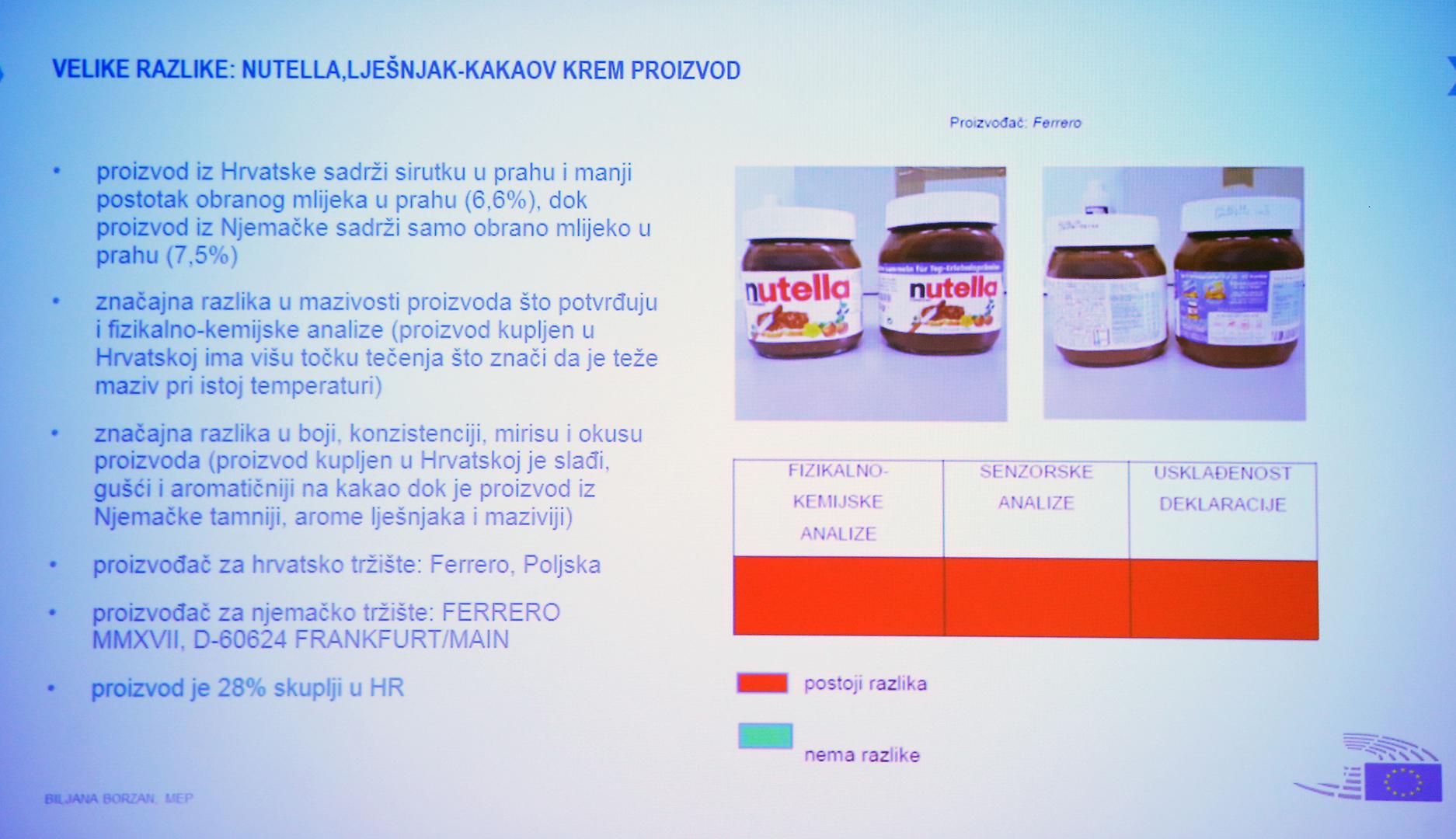 Značajna razlika utvrđena je i kod Nutelle, gdje proizvod u Hrvatskoj sadrži sirutku kao jeftiniju sirovinu i manji postotak obranog mlijeka, dok u Njemačkoj ima samo obrano mlijeko.