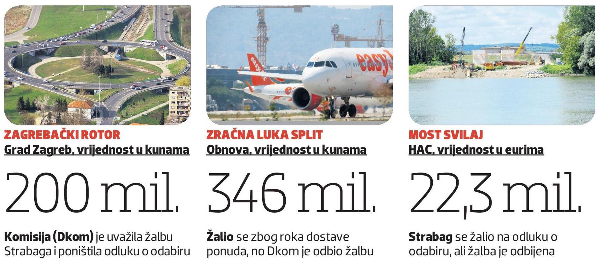 U posljednjih deset godina Strabag je tako Dkomu uložio 36 žalbi od kojih je njih 20 odbijeno. U osam slučajeva prihvaćen je zahtjev te tvrtke da se poništi odluka o odabiru. Zadnji takav slučaj bio je krajem prošle godine kad se Strabag žalio na odluku Grada Zagreba da posao rekonstrukcije rotora povjeri zajednici ponuditelja Kamgrada, Hidroelektre niskogradnje, DIV-a i Tigre koji su ponudili 184 milijuna kuna. Na natječaj je pristiglo šest ponuda, a ostalih pet, među njima i Strabagova od 234 milijuna kuna, proglašene su nevaljanim. Dkom je poništio tu odluku o odabiru.