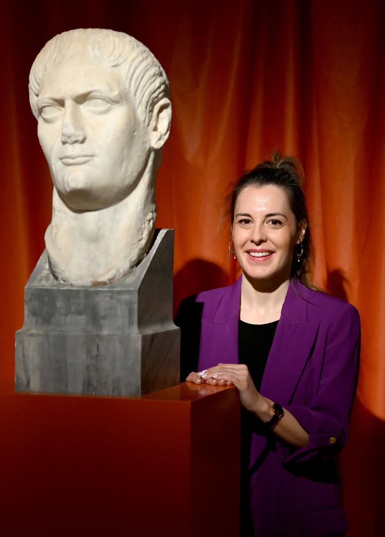 Autorica izložbe Jelena Jovanović uz bistu cara Trajana koji je ‘prekucan’ preko lika cara Domicijana za kojeg je Senat izglasao damnatio memoriae, praksu kojom su Rimljani posmrtno kažnjavali loše careve brišući tragove njihova postojanja